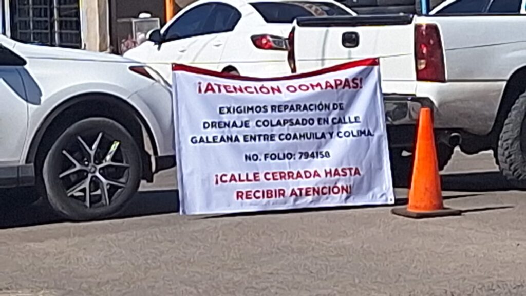 Redacción de RTN Medios Ciudadanos cerraron este viernes la circulación en la calle Galeana y Coahuila, en Ciudad Obregón, para exigir a Oomapasc la reparación de un drenaje colapsado. Los vecinos colocaron un mensaje dirigido al organismo operador donde se lee: “Exigimos reparación en drenaje colapsado en calle Galeana entre