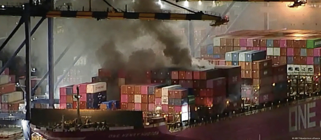 Se incendia un buque de carga en el puerto de Los Ángeles, Estados Unidos