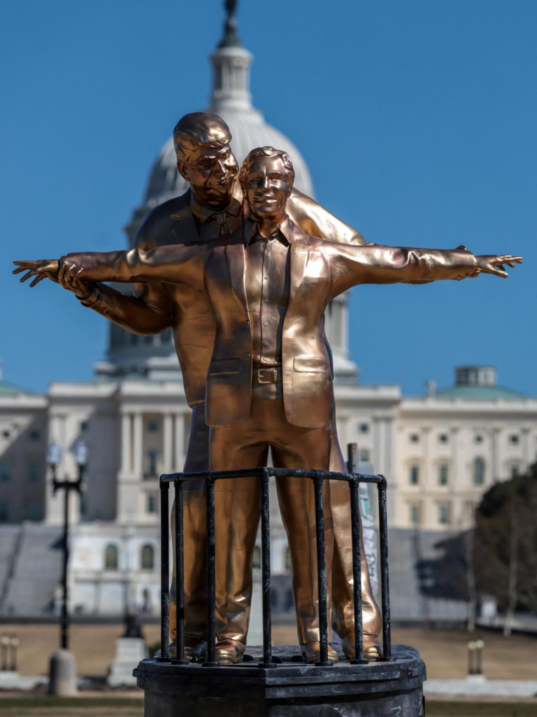 Instalan polémica estatua de Trump y Jeffrey Epstein en Washington D.C.