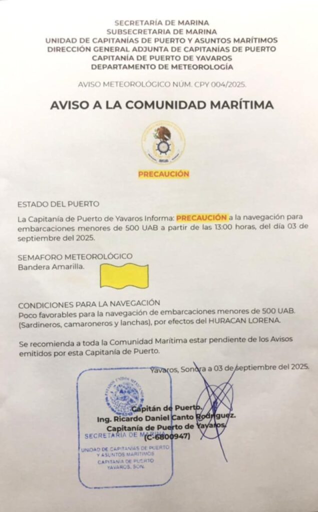 3 de septiembre de 2025; Yavaros, Sonora.- La Capitanía de Puerto de Yavaros emitió un aviso de precaución para la navegación de embarcaciones menores de 500 UAB, incluyendo sardineros, camaroneros y lanchas, a partir de este miércoles 3 de septiembre, debido a los efectos del huracán Lorena.