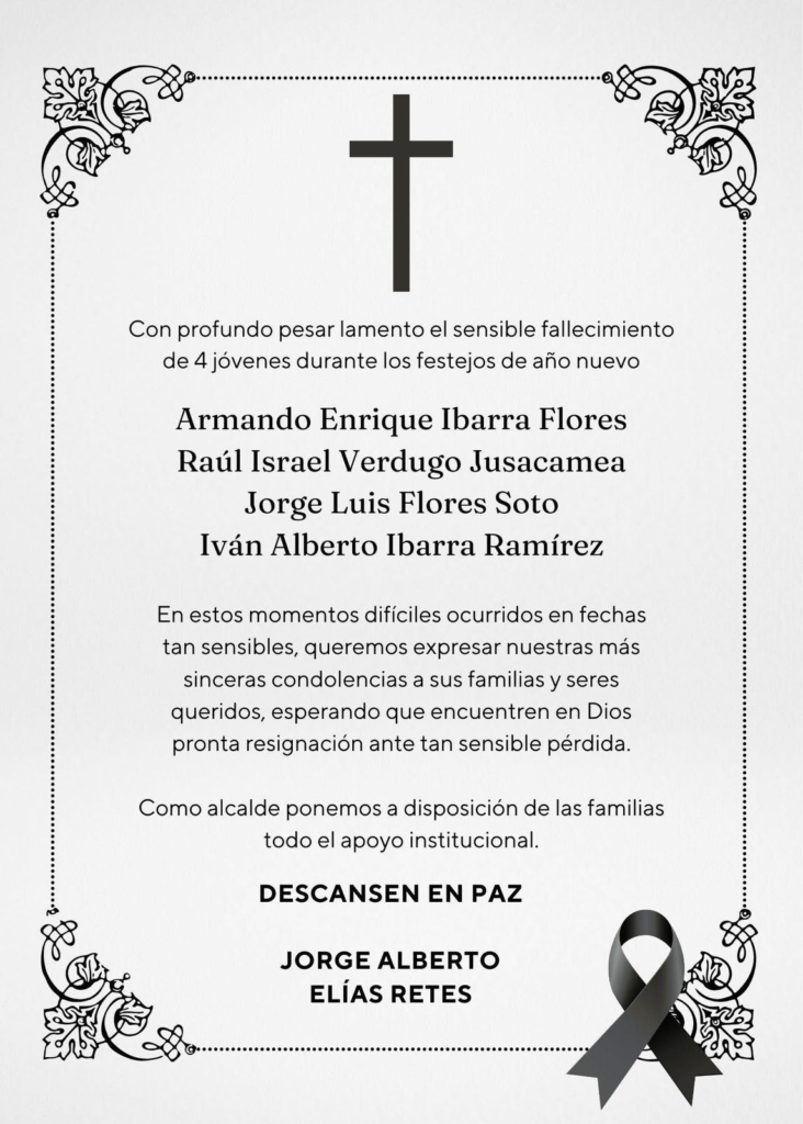 “En estos momentos difíciles, ocurridos en fechas tan sensibles, queremos expresar nuestras más sinceras condolencias a sus familias y seres queridos, esperando que encuentren en Dios pronta resignación ante tan sensible pérdida”, expresó el alcalde en su mensaje.
