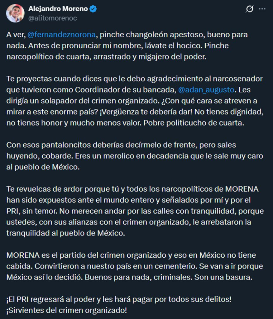 El dirigente nacional del PRI, Alejandro “Alito” Moreno, lanzó una serie de descalificaciones públicas contra el senador de Morena, Gerardo Fernández Noroña, luego de que éste afirmara que el priista “le debe agradecimiento” a Adán Augusto López.