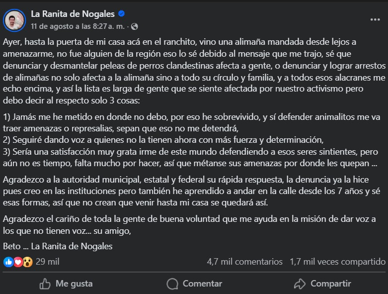 “Vino una alimaña mandada desde lejos a amenazarme; no era de la región, lo sé por el mensaje que me trajo. Denunciar y desmantelar peleas de perros, o lograr arrestos, afecta no solo a la alimaña sino a su círculo y familia, y eso me ha echado encima a muchos.”, expresó.
