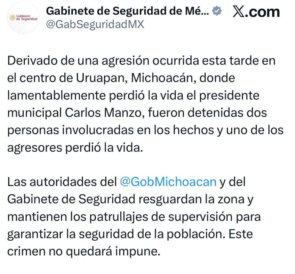 “Derivado de una agresión ocurrida esta tarde en el centro de Uruapan… lamentablemente perdió la vida el presidente municipal Carlos Manzo.”