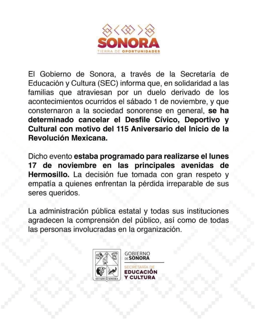 En un comunicado, la Secretaría de Educación y Cultura (SEC) informó que el evento estaba programado para realizarse el lunes 17 de noviembre en las principales avenidas de la capital sonorense. Sin embargo, la decisión se tomó como un gesto de respeto y empatía hacia las personas que enfrentan la pérdida de sus seres queridos tras la tragedia que enlutó a todo el estado.