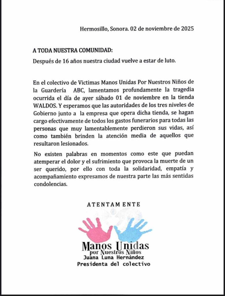 El colectivo Víctimas Manos Unidas por Nuestros Niños de la Guardería ABC expresó su profundo pesar por la tragedia ocurrida el pasado sábado 1 de noviembre en la tienda Waldo’s del centro de Hermosillo, donde 23 personas perdieron la vida tras una explosión e incendio dentro del establecimiento.