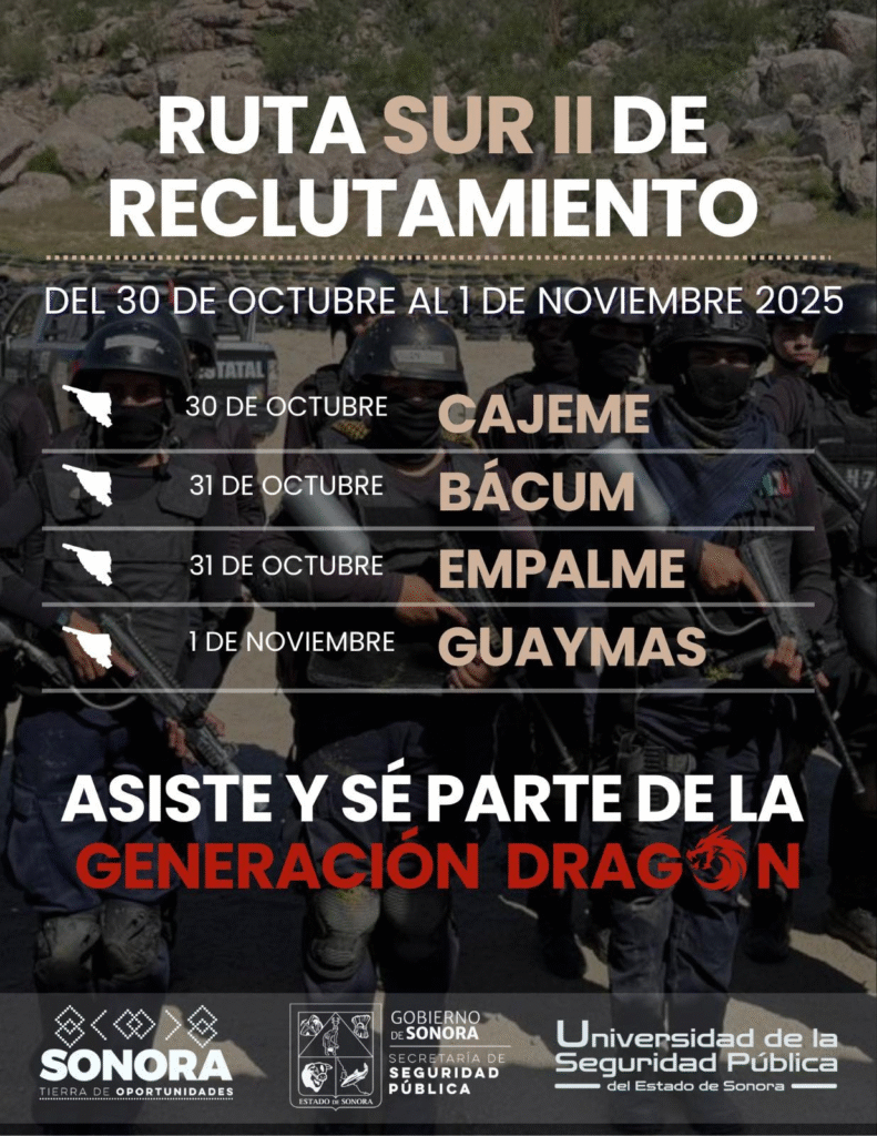La segunda ruta de reclutamiento de la USP se realizará del 30 de octubre al primero de noviembre del presente año y, tiene la finalidad de fortalecer los estados de fuerza en los municipios de Cajeme, Bácum, Empalme y Guaymas, así como en el resto de las corporaciones de seguridad pública.