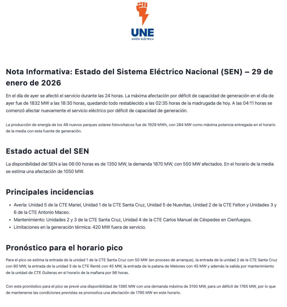 De acuerdo con su reporte técnico del Sistema Eléctrico Nacional, el país enfrenta un déficit severo de generación, con una disponibilidad muy por debajo de la demanda proyectada para el horario pico.