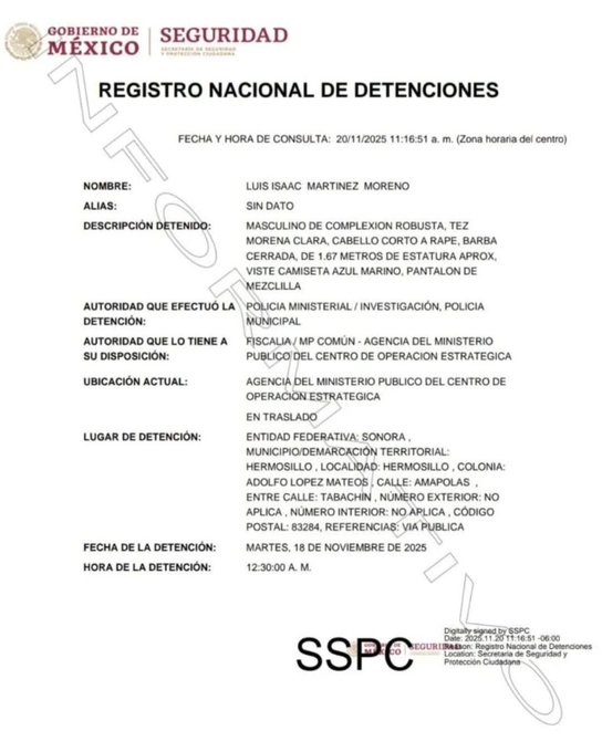 De acuerdo con el Registro Nacional de Detenciones, Martínez Moreno permanece a disposición del Ministerio Público, que determinará su situación jurídica tras la ejecución de una orden de aprehensión por elementos de la Policía Ministerial, Municipal y de Investigación. La ficha oficial señala que la detención ocurrió en la colonia Adolfo López Mateos, sobre la calle Amapolas.