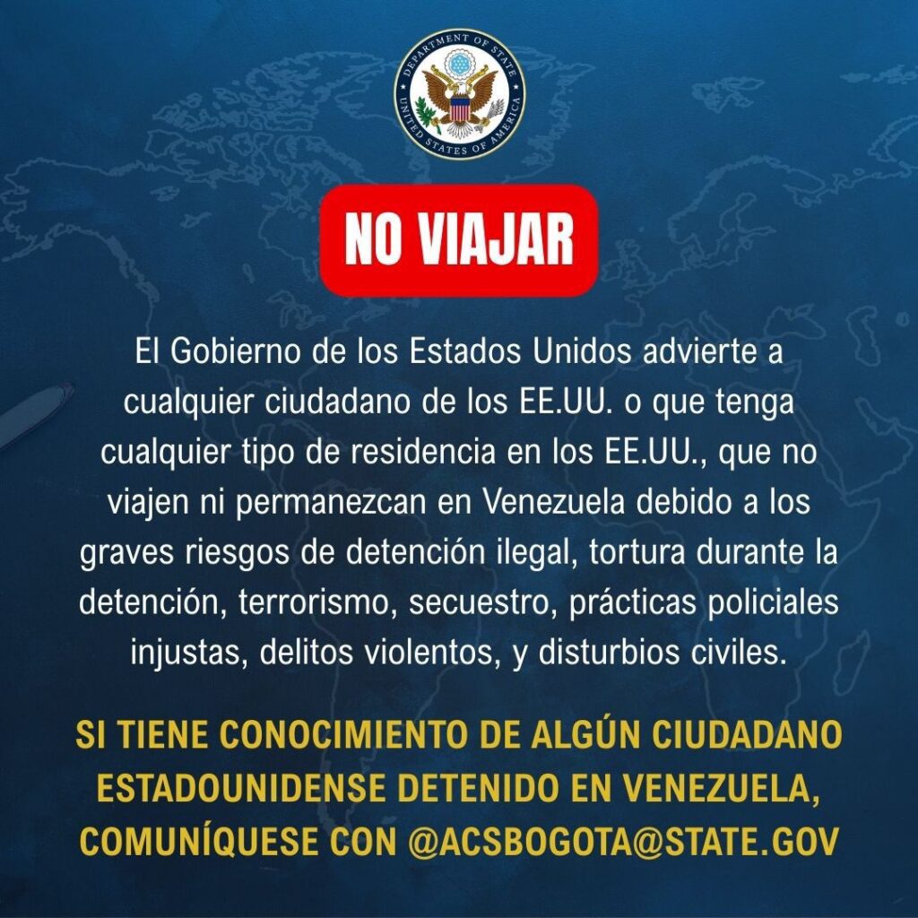 La Embajada de los Estados Unidos en Venezuela advirtió a cualquier ciudadano estadounidense o residente legal en EE.UU. que se abstenga de viajar o permanecer en territorio venezolano, debido a los graves riesgos asociados: “detención ilegal, tortura durante la detención, terrorismo, secuestro, prácticas policiales injustas, delitos violentos y disturbios civiles”.