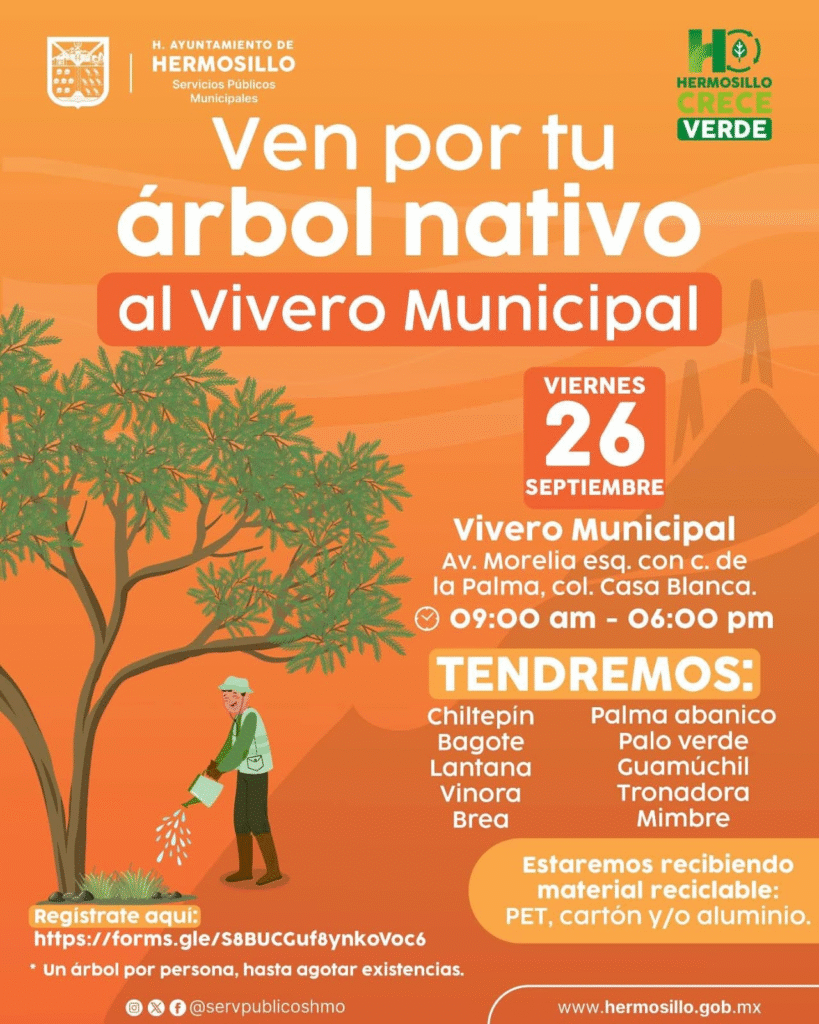 El Ayuntamiento de Hermosillo, a través de Servicios Públicos Municipales, invita a la ciudadanía a participar en la entrega de árboles nativos que se llevará a cabo este viernes 26 de septiembre en el Vivero Municipal.