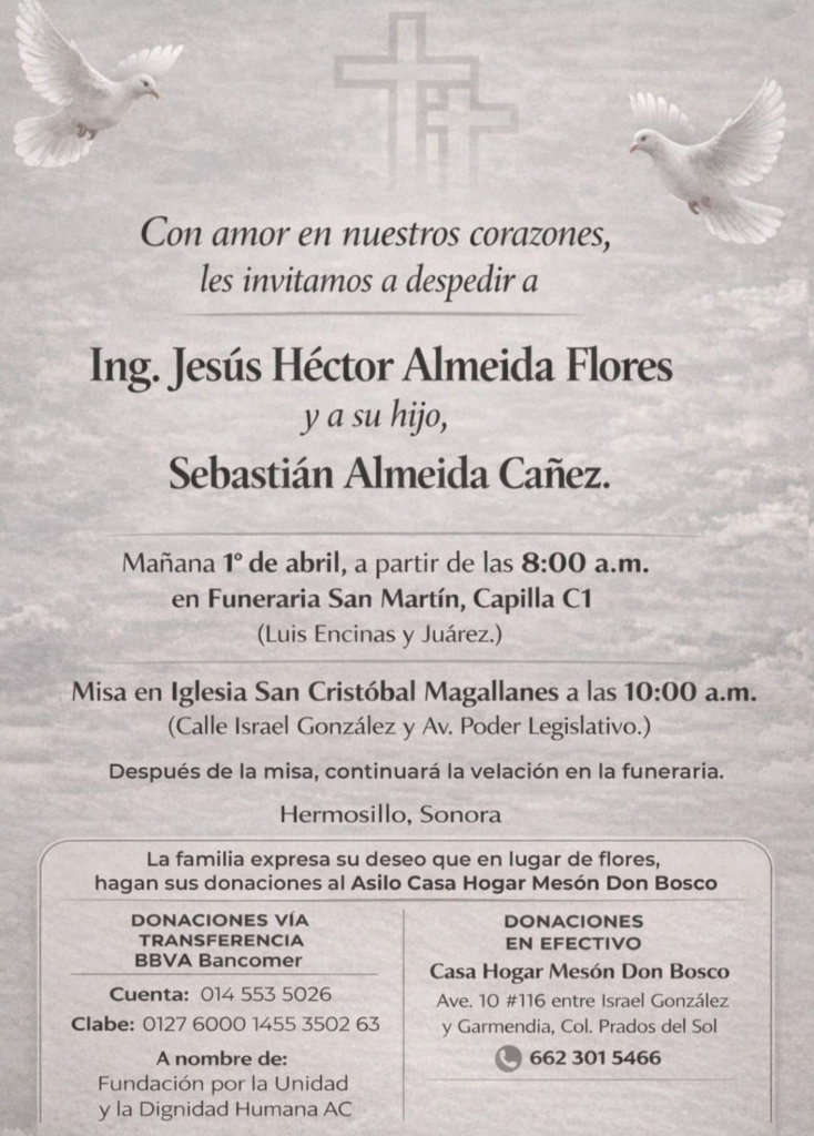 En medio del duelo por la muerte de Jesús Héctor Almeida Flores y su hijo, Sebastián Almeida Cáñez, sus familiares hicieron un llamado a la ciudadanía para que, en lugar de enviar flores, realicen donaciones al Asilo Casa Hogar Mesón Don Bosco.