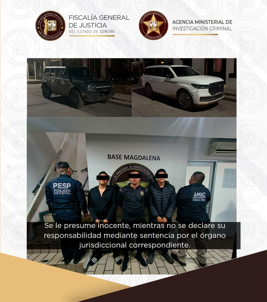 La Fiscalía General de Justicia del Estado de Sonora (FGJES) informa que elementos de la Policía Estatal de Seguridad Pública (PESP) realizaron la detención de tres sujetos en posesión de dos vehículos con reporte de robo en Estados Unidos de América (EUA), sobre la carretera salida Ímuris-Cananea.