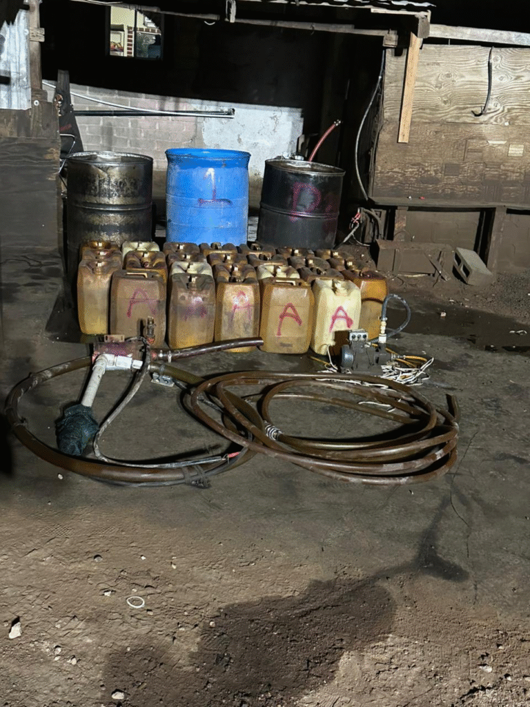 Durante el operativo, las autoridades localizaron un contenedor de 200 litros que contenía 40 litros de aparente hidrocarburo, así como 26 bidones vacíos de 20 litros de capacidad, dos bombas hidráulicas, tres mangueras conectadas a dichas bombas y dos contenedores adicionales de 200 litros de capacidad.
