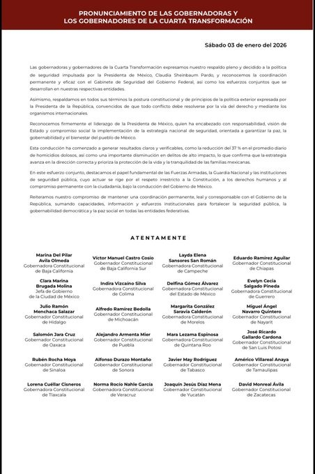 Gobernadoras y gobernadores de la Cuarta Transformación emitieron este sábado 3 de enero de 2026 un pronunciamiento conjunto en el que expresaron su respaldo total a la política de seguridad impulsada por la presidenta Claudia Sheinbaum Pardo, así como a la coordinación permanente con el Gabinete de Seguridad del Gobierno de México.