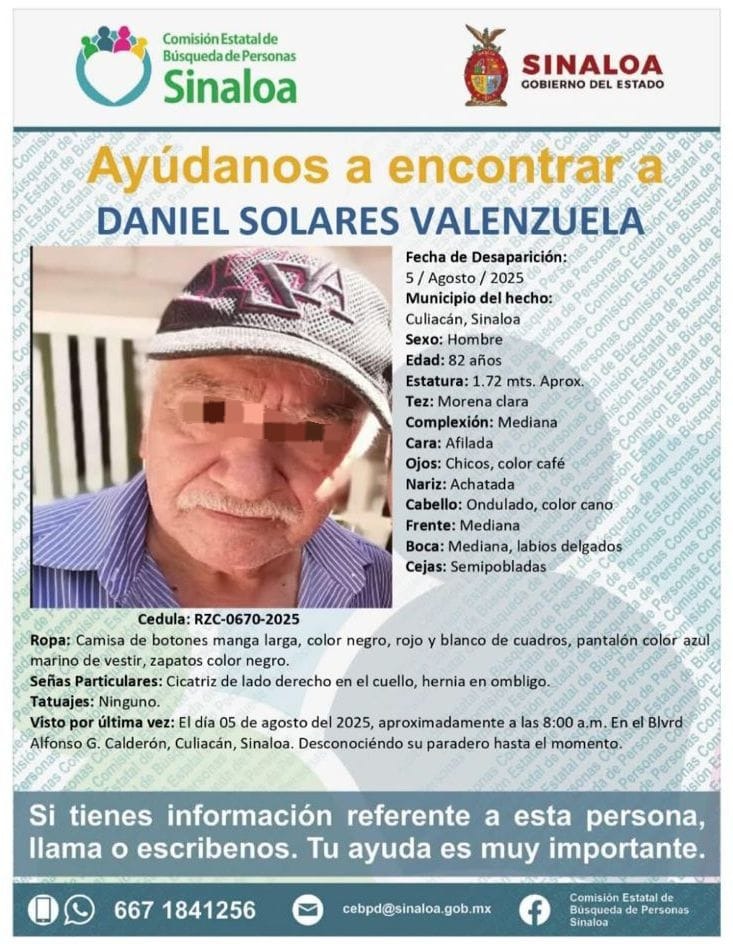 La tarde de este viernes, fue localizado el cuerpo de un hombre en avanzado estado de putrefacción a espaldas de la central de autobuses de Culiacán, Sinaloa. Según información extraoficial, la víctima sería Daniel Solares Valenzuela, un hombre de 82 años que había desaparecido el 5 de agosto tras llegar a la central con su esposa para realizar unos trámites. Según su esposa, él le dijo que iría usar el baño de un supermercado cercano, pero nunca regresó.