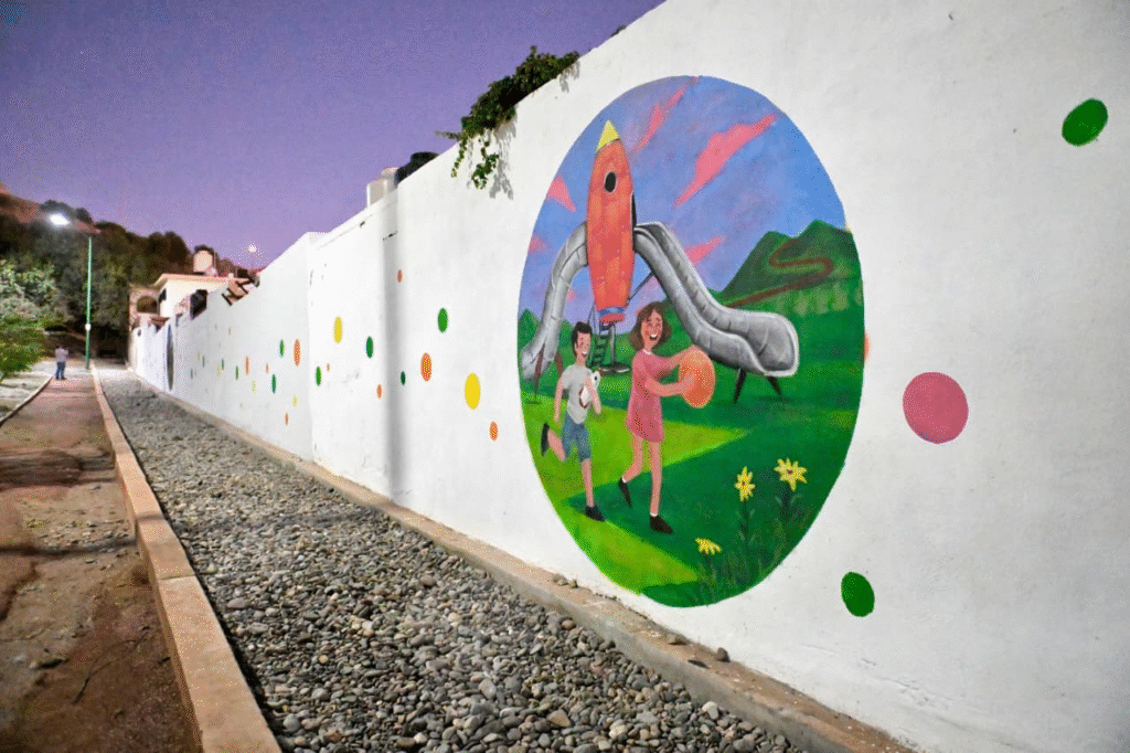 Familias de la colonia Loma Linda materializaron el sueño de contar con un espacio lleno de color, arte e identidad en su parque, destacó Antonio Astiazarán Gutiérrez al inaugurar un mural a cargo del Colectivo Sangre del Desierto.