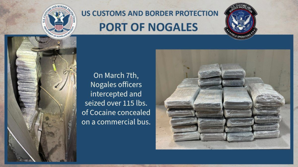Uno de los casos ocurrió el 7 de marzo, cuando oficiales de CBP interceptaron un autobús comercial en el que localizaron más de 115 libras de cocaína ocultas, equivalentes a aproximadamente 52 kilogramos del narcótico.