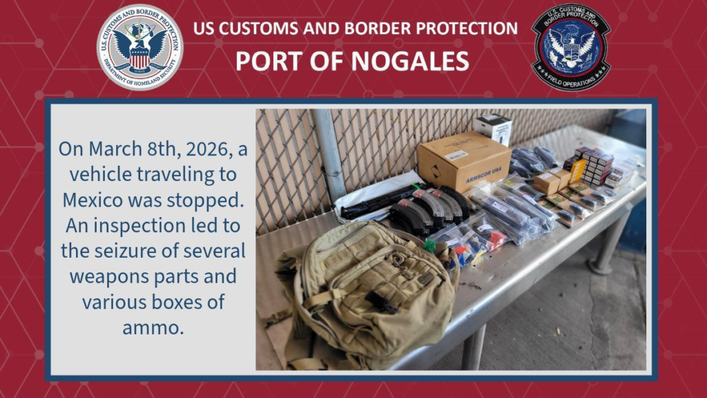 Asimismo, el 8 de marzo, agentes de CBP detuvieron un vehículo que se dirigía hacia México. Durante la inspección, detectaron diversas piezas de armas y varias cajas de municiones, las cuales fueron aseguradas por las autoridades.