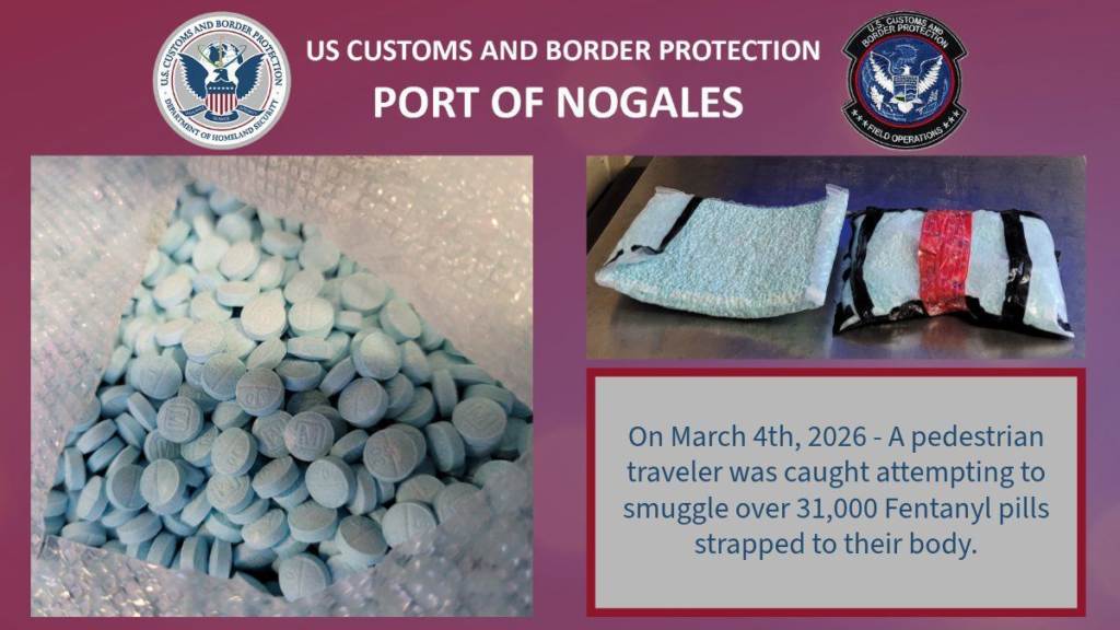 En otro incidente registrado el 4 de marzo, un viajero peatón fue sorprendido cuando intentaba cruzar la frontera con más de 31 mil pastillas de fentanilo sujetas a su cuerpo. El hallazgo se realizó durante una revisión por parte de oficiales fronterizos.