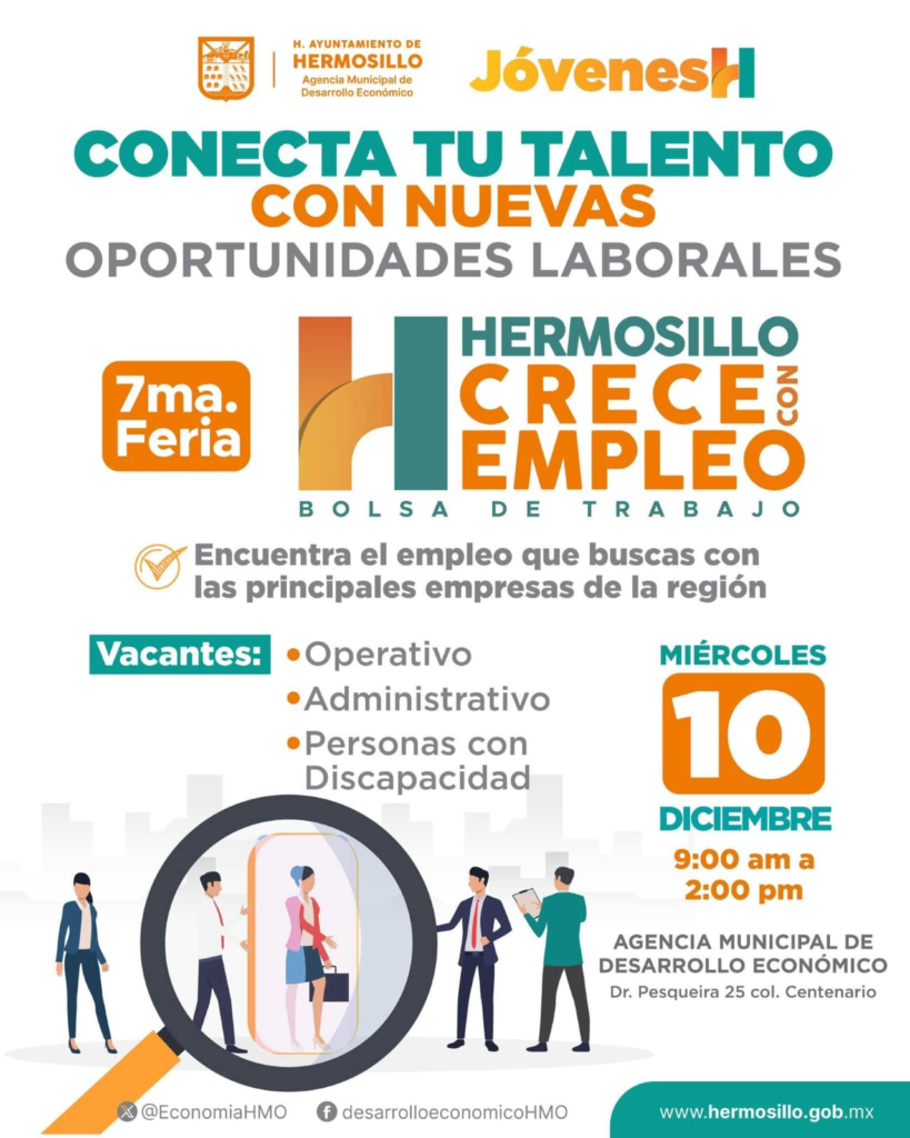 La Agencia Municipal de Desarrollo Económico, AMDE, en coordinación con el Instituto Hermosillense de la Juventud invita a la Séptima Feria Hermosillo CRECE con Empleo el próximo miércoles 10 de diciembre.