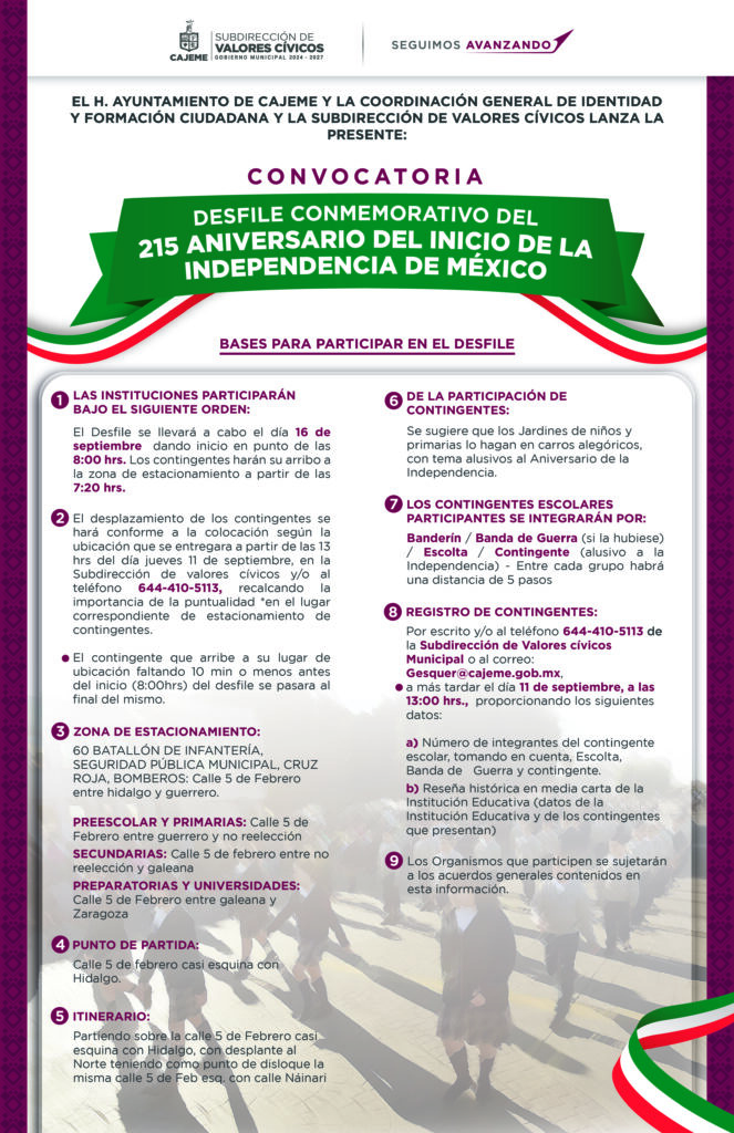 Con el propósito de conmemorar la Independencia de México y fortalecer en las nuevas generaciones el respeto a nuestros símbolos patrios, el Ayuntamiento de Cajeme a través de la Coordinación General de Identidad y Formación Ciudadana en conjunto con la Subdirección de Valores Cívicos, emitió la convocatoria para participar en el desfile cívico militar que se llevará a cabo el próximo 16 de septiembre.