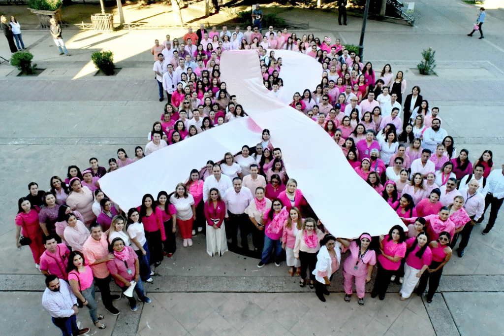 En un acto simbólico y de sensibilización, el presidente municipal, Antonio Astiazarán Gutiérrez, encabezó la formación de un lazo humano gigante frente al Palacio Municipal, junto a servidoras y servidores públicos del Ayuntamiento de Hermosillo, con motivo del Día Mundial de la Lucha contra el Cáncer de Mama, que se conmemora cada 19 de octubre.