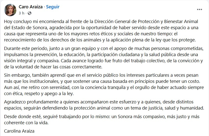 Luego de que circulara información sobre su presunto despido, Carolina Araiza confirmó a través de redes sociales su salida de la Dirección General de Protección y Bienestar Animal del Estado de Sonora.