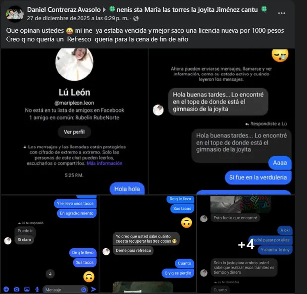 En los mensajes, la mujer dijo haber hallado las credenciales “en el tope de donde está el gimnasio de la joyita”. El dueño respondió sorprendido y agradecido, pero ella solicitó dinero a cambio de regresar los documentos.
