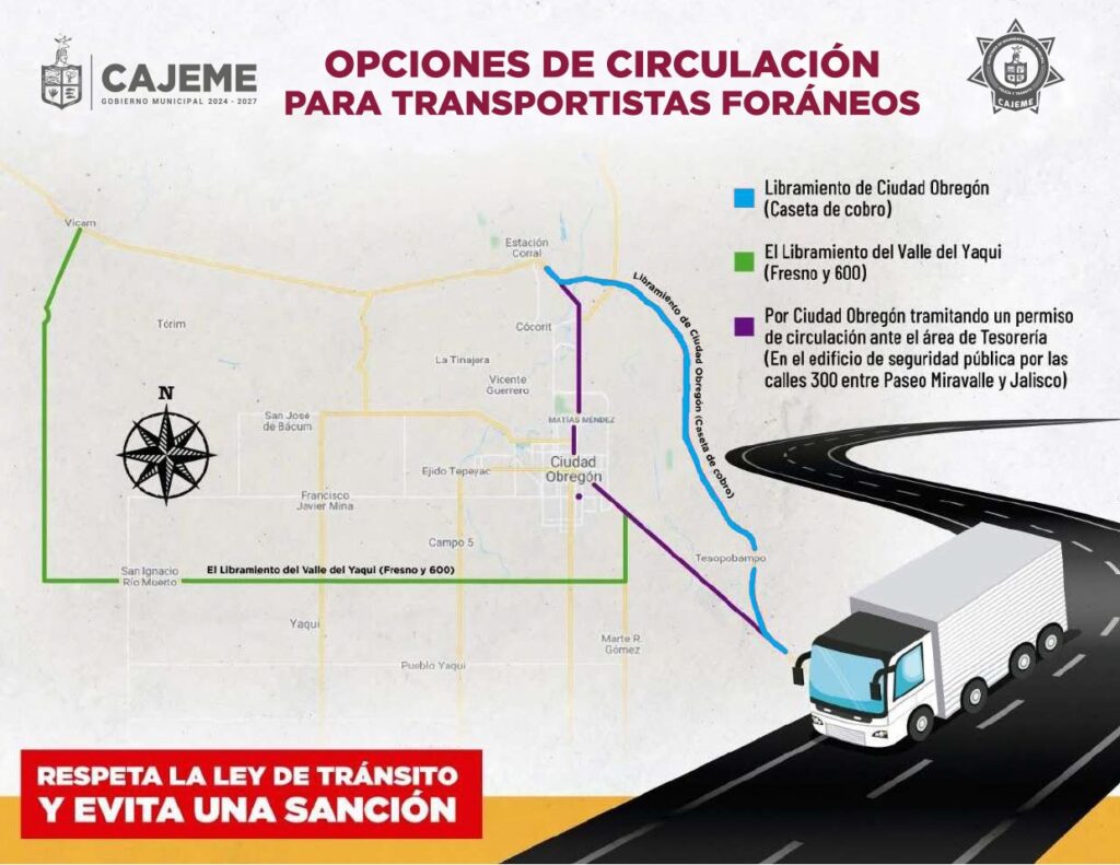 El Ayuntamiento de Cajeme informó sobre las rutas alternas que deben seguir autobuses y transportes de carga pesada para evitar sanciones. Quienes circulen por calles no autorizadas podrían recibir multas de entre 9 y 10 mil pesos, además del costo del remolque de las unidades.