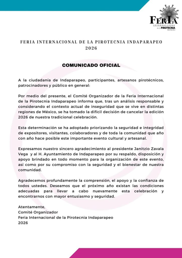 A través de un comunicado oficial, el Comité Organizador de la tradicional feria en Indaparapeo informó la cancelación definitiva de su edición 2026. Tras un «análisis responsable» del contexto de inseguridad que afecta a diversas entidades del país, los organizadores determinaron que no es posible garantizar la integridad de artesanos, expositores y visitantes.