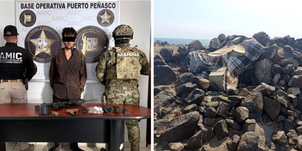 En el sitio se detuvo a Eduardo “N”, de 29 años, originario de Sinaloa, quien se encontraba en posesión de un fusil de asalto AR-15 con 59 cartuchos calibre .223, una pistola calibre 9 milímetros con 17 cartuchos, un par de binoculares, un radio transmisor y 7 gramos de marihuana.