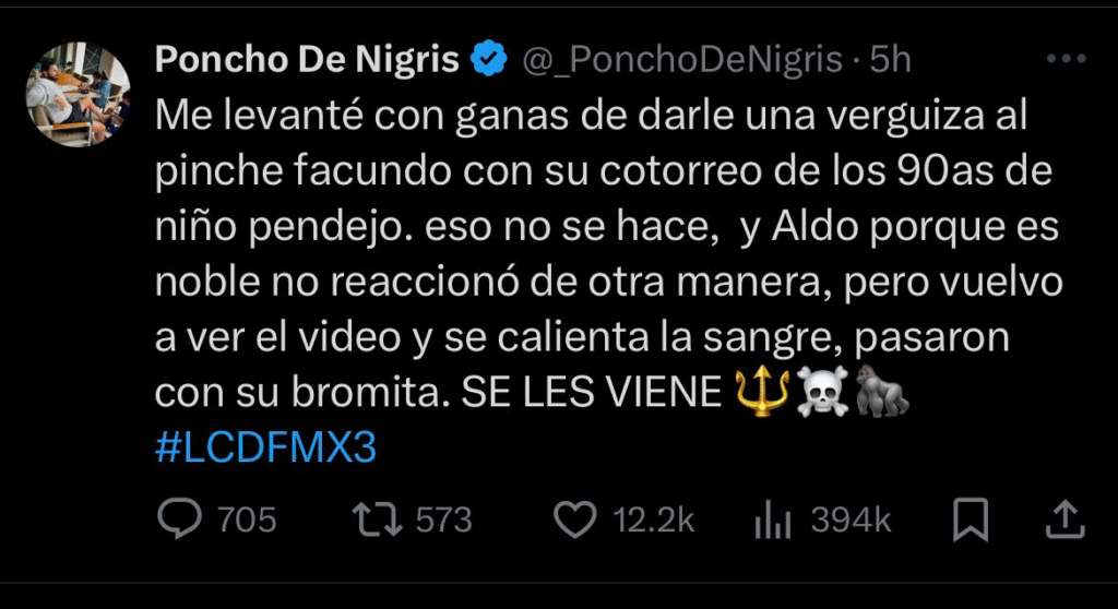 El hecho de que Facundo tirara a Aldo de Nigris no solo encendió el ambiente dentro de La Casa de los Famosos México 2025, sino que también traspasó las paredes del reality, pues Poncho de Nigris, tío de Aldo, explotó y lanzó fuertes mensajes contra Facundo a través de su cuenta de X (antes Twitter) e Instagram.