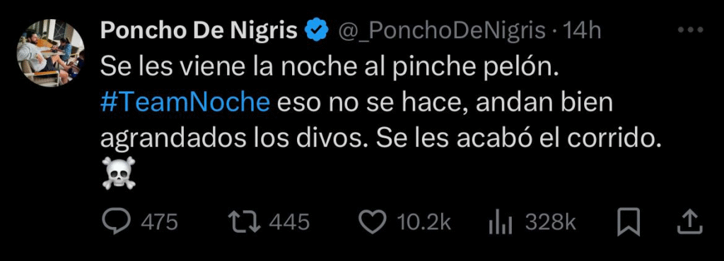 «Se pasó de lanza! Como me gustaría haber estado ahí, Aldo lo respeta porque no quiere pedos pero eso no se hace. Se les viene la noche. Se les viene la noche al pinche pelón. #TeamNoche eso no se hace, andan bien agrandados los divos. Se les acabó el corrido»