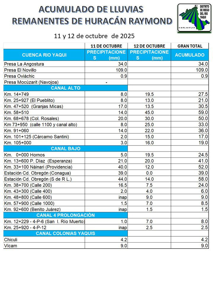 Las lluvias del fin de semana en Ciudad Obregón, derivadas de la tormenta tropical Raymond, dejaron entre 39 y 58 milímetros de precipitación en distintos sectores de la ciudad, de acuerdo con el Distrito de Riego del Río Yaqui.