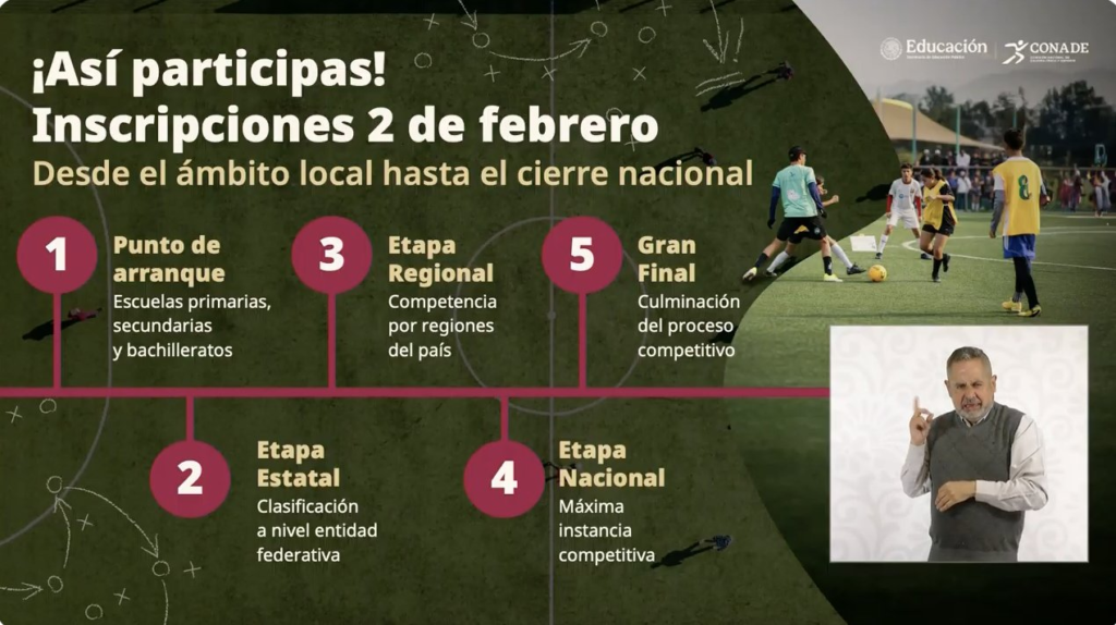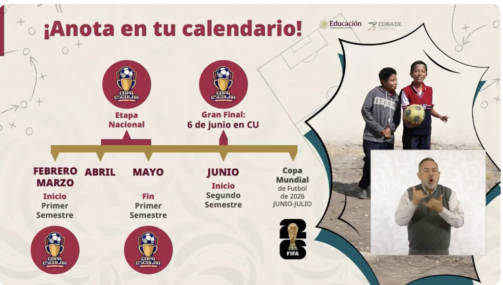 Con la finalidad de incentivar el deporte en las infancias y con la fiebre del Mundial 2026, el Gobierno de México ha impulsado diversas campañas para convocar a la Copa Nacional Escolar donde «las niñas, niños y los jóvenes serán los protagonistas».