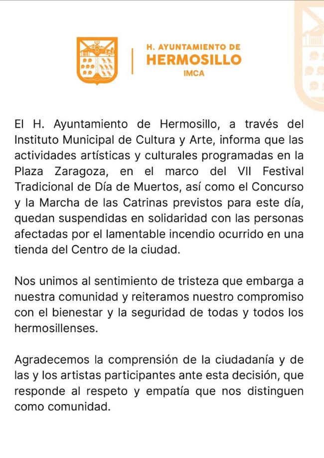 El Ayuntamiento agradeció la comprensión del público y de los artistas participantes, subrayando que la decisión responde al respeto y la empatía que distinguen a la comunidad hermosillense en momentos difíciles.