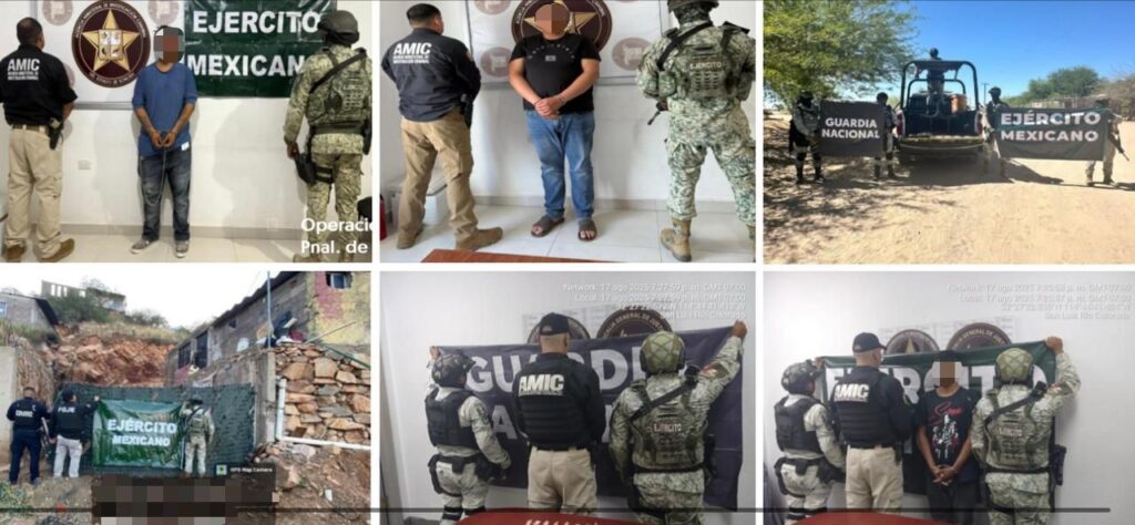 Hermosillo, Sonora; 28 de agosto de 2025.– En operativos coordinados en distintos municipios del estado, autoridades integrantes de la Mesa Estatal de Seguridad llevaron a cabo la desarticulación de una célula delictiva con la detención de 18 personas y el aseguramiento de un arsenal de armas de fuego, más de