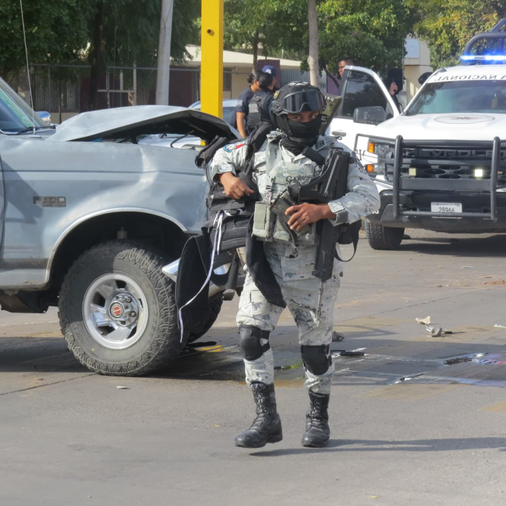 Tres elementos de la Guardia Nacional resultaron lesionados, uno de ellos de consideración, tras un accidente de tránsito registrado la mañana de este jueves en el cruce de las calles Sahuaripa y Morelos, donde se vieron involucradas una unidad oficial y una camioneta tipo Ford.