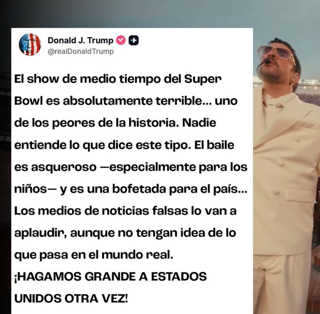 Trump afirmó que la presentación del artista puertorriqueño no representa los estándares de éxito, creatividad y excelencia de los estadounidenses, declaraciones que generaron reacciones encontradas en redes sociales, donde seguidores del cantante defendieron el impacto cultural y global del género urbano y latino.