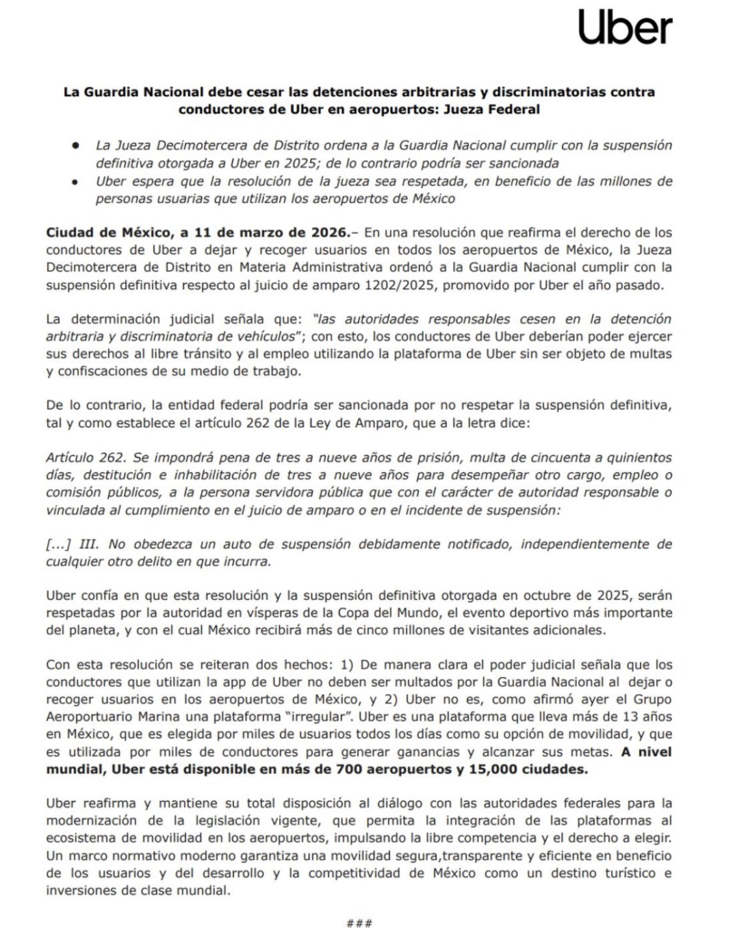 La compañía informó que una jueza federal otorgó una suspensión definitiva dentro de un juicio de amparo que ordena a la Guardia Nacional abstenerse de multar o detener a conductores que utilizan la aplicación dentro de las terminales aéreas.