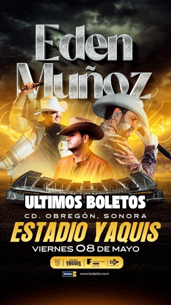 Edén Muñoz se presentará en vivo en el Estadio Yaquis el próximo viernes 8 de mayo, en un concierto que promete reunir a miles de seguidores del cantante sinaloense.